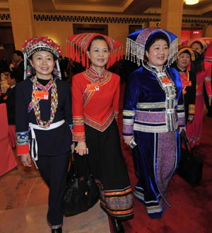 Ethnic minority deputies to the First Session of the 11th National People's Congress (NPC) walk to attend the opening of the NPC session at the Great Hall of the People in Beijing, capital of China, March 5, 2008. The First Session of the 11th NPC opens on Wednesday. [Xinhua]