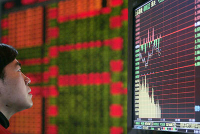 A man reads information on an electronic screen at a brokerage house in Shanghai March 13, 2008. China's main stock index tumbled below 4,000 points Thursday to close at 3971.26 points for the first time in seven months, hit by concern about inflation and the market's ability to absorb large new supplies of shares. [Agencies]