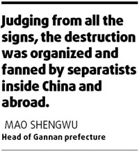 "Judging from all the signs, the destruction was organized and fanned by separatists inside China and abroad," Mao Shengwu, head of Gannan prefecture, where eight policemen and three government employees were injured, said.