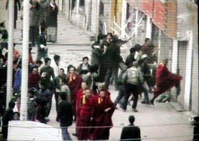 A video grab of CCTV International shows rioters and monks attack a shop during the March 14 riot in Lhasa. [CCTV International]