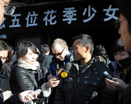 Tang Qingyan, a worker in Yishion clothing store where five sales assistants were burned to death in an arson attack by the rioters, tells the details of the atrocity as journalists listen during an interview in Lhasa, capital of southwest China's Tibet Autonomous Region, March 27, 2008. Reporters, from 19 media organizations including the US-based Associated Press, Britain's Financial Times and the South China Morning Post in Hong Kong, were touring the Tibetan capital on a three-day trip following the recent riots. [Xinhua]