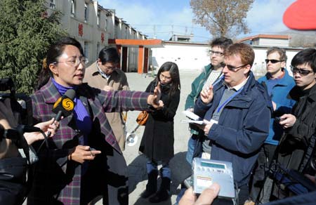 Degyi Zhoiyar, a teacher with Lhasa No. 2 Middle School, tells how her school buildings were torched during the riot as overseas journalists listen during an interview in Lhasa, capital of Southwest China's Tibet Autonomous Region, March 27, 2008. [Xinhua]