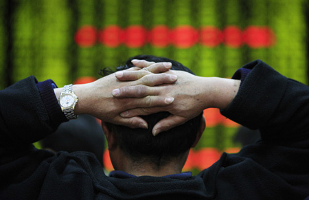 A man reads information on an electronic screen at a brokerage house in Shanghai April 1, 2008. Chinese shares nosedive 4.13 percent on Tuesday after central bank vowed to continue tightening monetary policies.[Xinhua]