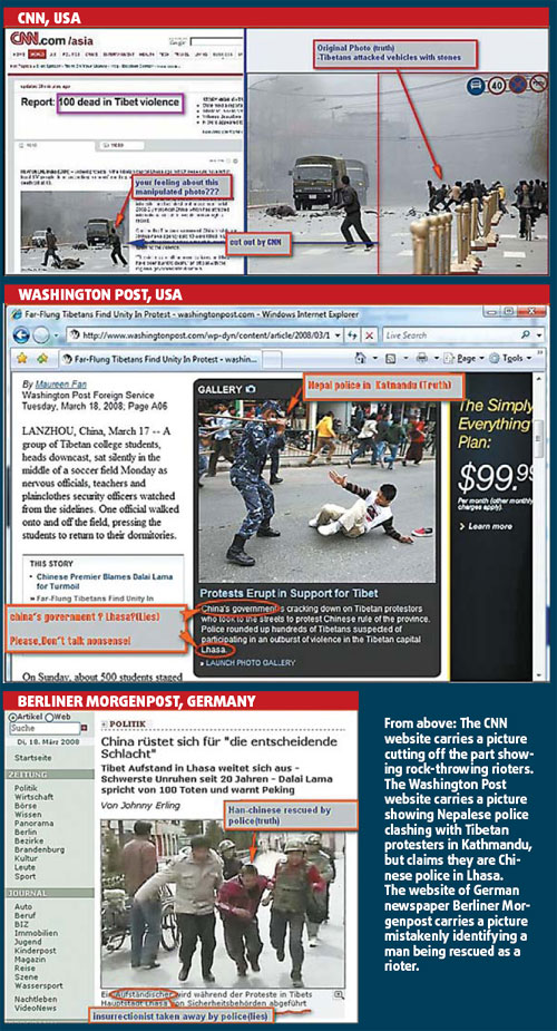 More notably, the websites of Germany's Bild newspaper, N-TV and RTL TV, and the Washington Post all used pictures of baton-wielding Nepalese police in clashes with Tibetan protesters in Kathmandu, claiming that the officers were Chinese police. However, the fact is that Nepalese security forces were confronting demonstrators with batons.