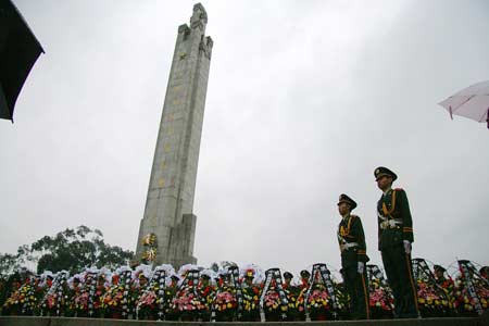 Flowers are seen in front of a monument at a martyr cemetery in Xiamen, East China's Fujian Province, April 3, 2008, one day before the traditional Qingming Festival. [Xinhua]