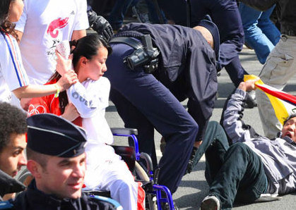 Jin Jing Holds on tightly to the torch to keep it away from attackers during the Paris leg of the relay April 7, 2008. [Xinhua]