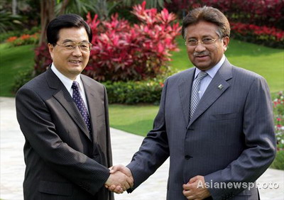 President Hu Jintao and visiting Pakistani President Pervez Musharraf meet in Sanya, Hainan province, on Friday. [Asianewsphoto]