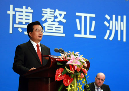 Chinese President Hu Jintao delivers a speech at the opening ceremony of the Boao Forum for Asia (BFA) annual conference in Boao, Hainan on April 12, 2008. [Xinhua]