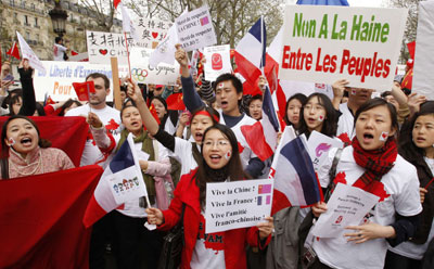 Thousands of Chinese students and expatriates demonstrate to support the upcoming Beijing Olympics and denounce some French media for their distorted reports on the March 14 Lhasa riots, in Paris April 19, 2008.  [Agencies]