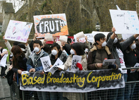 Thousands of Chinese students and expatriates convene in Old Palace Yard in London on April 19, 2008, to protest against the BBC's and other British news organizations' distorted and lopsided reports on Tibetan secessionist violence and London leg of Olympics torch relay. [Lei Xiaoxun/chinadaily.com.cn]