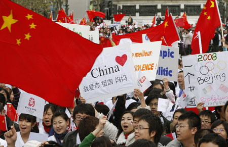 Overseas Chinese demonstrate to support China and the forthcoming Beijing Olympic Games, in Paris April 19, 2008. [Agencies]