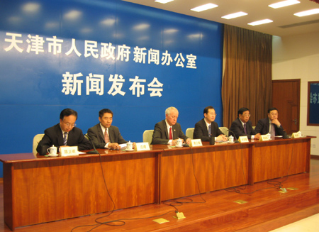 John C. Thomson (3rd from left), chief representative of Chicago China Office, and Tianjin Vice-Mayor Ren Xuefeng (4th from left) attend the press conference annoucing the signing of friendship and co-operative agreement between Chicago adn Tianjin. [Agencies]