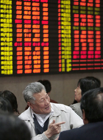 A man gestures in front of an electronic board showing stock information at a brokerage house in Nanjing, Jiangsu province April 24, 2008. China's main stock index soared over 9 percent in frenzied trade on Thursday after the government cut the share trading tax, seeking to boost investors' confidence. [Agencies]