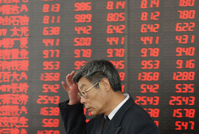 A man gestures in front of an electronic board showing stock information at a brokerage house in Hefei, Anhui province April 24, 2008. China's main stock index soared over 9 percent in frenzied trade on Thursday after the government cut the share trading tax, seeking to boost investors' confidence. [Agencies]