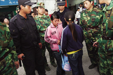 A young girl from Sichuan Province cries on Monday after being rescued by security guards from a factory in Dongguan, Guangdong Province, where she had been forced to work. [Southern Metropolis Daily]