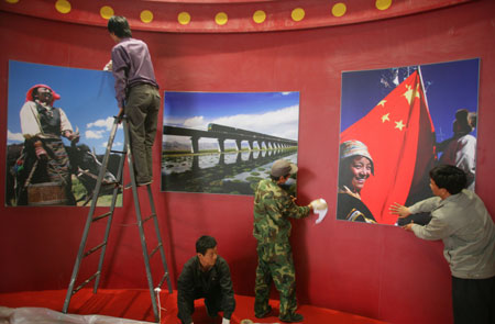 Workers arrange pictures in the Culture Palace of the Nationalities in Beijing April 30 for an exhibition on the history and development of Tibet, which opens Tuesday. [China Daily]