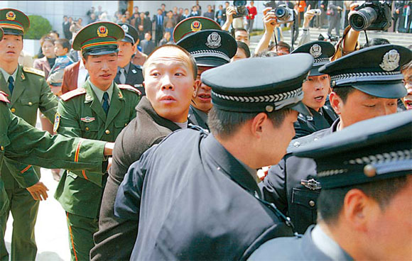 She Xianglin (third from left), a resident of Hubei province who was held in prison for 11 years for a murder he did not commit, is escorted by police while leaving the Jingshan county people's court, which acquitted him on April 13, 2005. [China Daily]