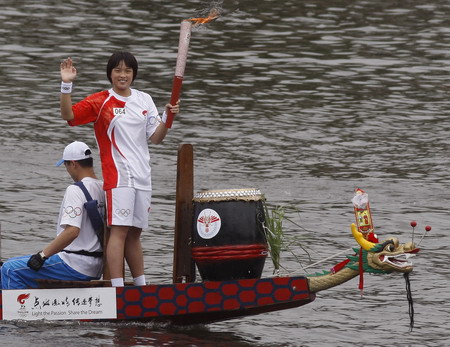 Hong Kong swimmer Sze Hang-yu carries the Olympic torch on a dragon boat during the torch relay in Hong Kong May 2, 2008. [Agencies]