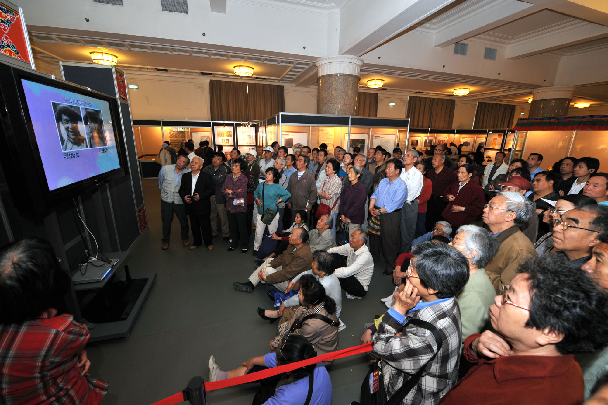 Visitors watch a video at the exhibition "Tibet of China: Past and Present" at the Cultural Palace of Nationalities in Beijing May 5, 2005. [Xinhua]