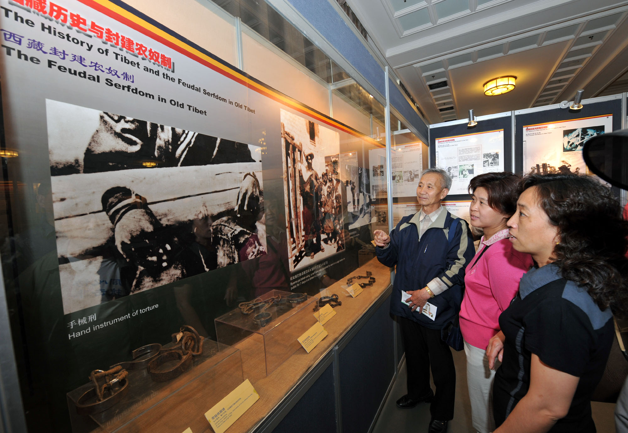 Visitors stop and have a close look at a photo at the exhibition "Tibet of China: Past and Present" at the Cultural Palace of Nationalities in Beijing May 5, 2005. [Xinhua]