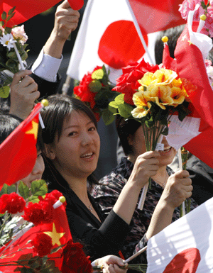 Chinese residents in Japan welcome Chinese President Hu Jintao upon his arrival at Tokyo's Haneda airport May 6, 2008. Hu began his five-day "warm spring" trip to Japan, aimed at boosting the strategic and mutually beneficial relationships between the two countries. [Agencies]