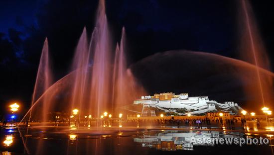 A night view shows the lit-up Potala Palace in Lhasa, Southwest China's Tibet Autonomous Region May 6, 2008. Tibet has reopened its main temples to overseas tourists, including the Potola Palace and the Sera Monastery. [Asianewsphoto]