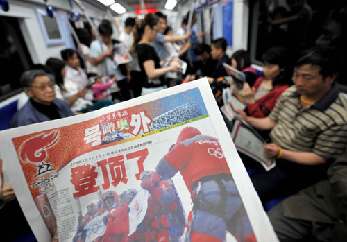 Beijing residents read a special addition of Beijing Youth Daily featuring the news of the Olympic torch's ascent on Mt. Qomolangma on Subway No. 2 on Thursday. The Olympic flame was lit on the world's highest peak at around 9:17 am on Thursday. [Xinhua]
