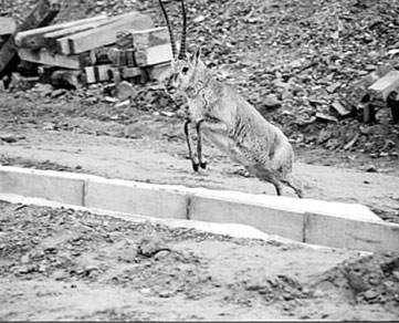 A Tibetan antelope crosses a building site during the construction of the Qinghai-Tibet Railway. [File photo]
