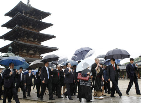 Chinese President Hu Jintao (2nd R) is escorted by Chief Priest Genmyo Ono (3rd R) in front of a five story pagoda as he visits the Horyuji temple in Ikaruga Town, western Japan May 10, 2008. [Agencies]