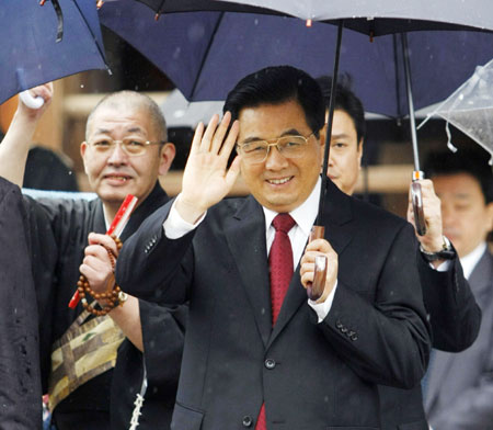 Chinese President Hu Jintao (C), flanked by Chief Priest Genmyo Ono (L), waves as he visits the Horyuji temple in Ikaruga Town, western Japan May 10, 2008. [Agencies]