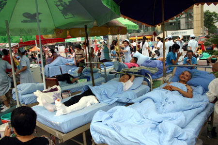 Patients lie on beds in the open ater being evacuated from a hospital in Chengdu, capital of Sichuan Province, 100 km away from the epicenter of the 7.8-magnitude quake on Monday. [Xinhua]