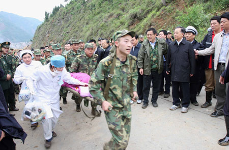 Premier Wen Jiabao makes way for an injured girl when he oversees the rescue work Wednesday, May 14, 2008, at Beichuan County, one of the regions worst hit by Monday's massive earthquake. The death toll is estimated at 3,000 to 5,000, with nearly 10,000 injured, in Beichuan. [Xinhua]