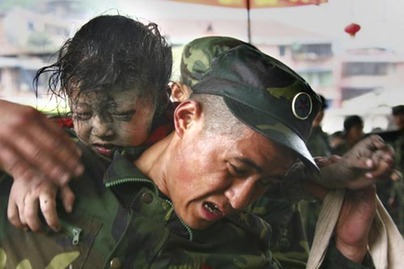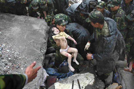 Soldiers rescue a child from the rubble at the earthquake-hit Beichuan County, about 160 kilometers northeast of the epicenter of Wenchuan County, Sichuan Province, May 13, 2008. [Agencies]