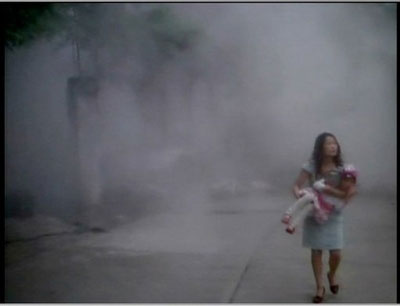 In this image from video, a young woman holding an infant walks from a cloud of dust during a powerful earthquake in a mountain reserve outside Chengdu, China, May 12, 2008. [Agencies]