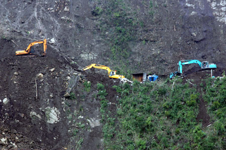 Repair work starts on damaged roads in Wenchuan County on Thursday. The connection to the epicenter was finally re-established on Thursday night. [China Daily]
