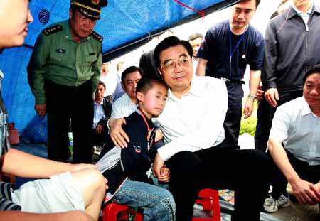Hu also hugged an 8-year-old boy when visiting a family in the camp and told him, "You must learn to be brave and not to surrender to difficulties even if you are a child. We shall have confidence, courage and strength."