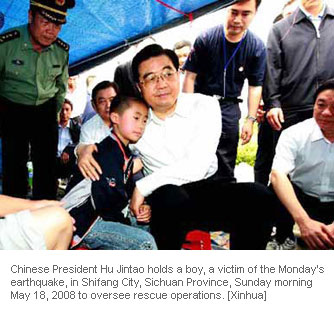 Chinese President Hu Jintao holds a boy, a victim of the Monday's earthquake, in Shifang City, Sichuan Province, Sunday morning May 18, 2008 to oversee rescue operations. [Xinhua]