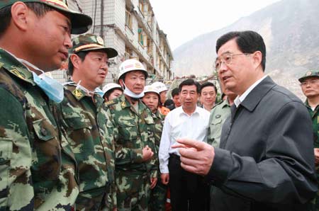Chinese President Hu Jintao (R) talks with rescuers when he inspects disaster relief work in the quake-hit Xuankou Town of Wenchuan County, Southwest China's Sichuan Province, May 17, 2008. [Xinhua]