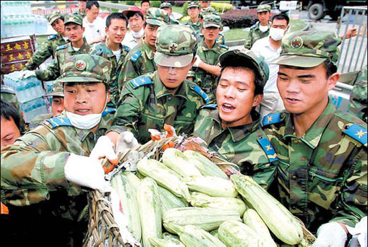 Soldiers carry vegetables out of the logistics center in Dujiangyan city, Sichuan province, yesterday. Most of the relief goods are carried to the center from where they are dispatched to the worst-hit areas. [Gao Erqiang/China Daily]