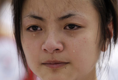 Gong Zhen, a student who survived when the earthquake hit Beichuan county, cries as she attends a ceremony with around 500 students before resuming classes at a factory training centre in Mianyang, Sichuan province, May 19, 2008. [Agencies]