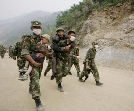 Soldiers carry residents from a nearby village as they leave the city of Beichuan, located around 150 km north of Chengdu, in Sichuan Province May 16, 2008. [Agencies]