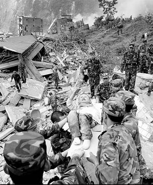 Three-year-old Langzhen raises his right arm to salute his saviors and said "Uncles, thank you" when the soldiers lifted him to safety. [China Daily]