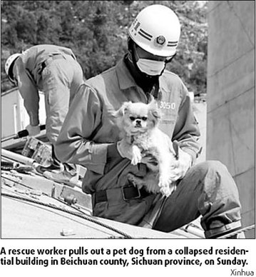 Amid ongoing rescue and relief efforts for Sichuan quake sufferers, the picture of a soldier saving a panting Pomeranian from the rubble has cast the spotlight on another side of the national disaster - the plight of animal victims.