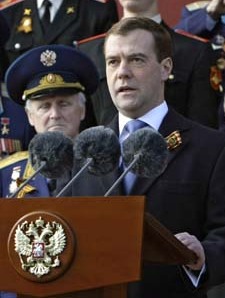 Russia's President Dmitry Medvedev speaks during a World War II victory ceremony in Moscow's Red Square May 9, 2008. [Agencies] |