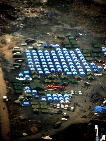 An aerial view of a temporary location for quake survivors in Yingxiu town, one of the most affected area in quake-hit Sichuan Province May 21, 2008. [Xinhua]