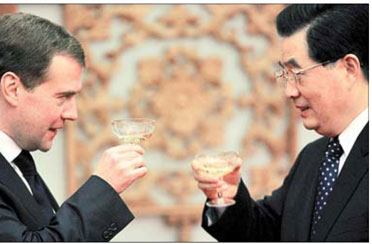 President Hu Jintao proposes a toast to his Russian counterpart Dmitry Medvedev at a signing ceremony in the Great Hall of the People in Beijing on Friday. [China Daily]