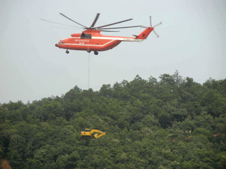 A Mig-26 helicopter transported a large bulldozer from Leigu, near Tangjiashan. By 7 p.m. on Monday, more than 10 diggers and bulldozers and 40-plus tons of relief materials, including tents, drinking water, food and gasoline, had been airlifted to the site.