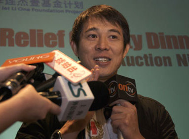 Jet Li speaks to reporters ahead of a charity dinner co-sponsored by China Daily Monday night May 26, 2008. [China Daily]