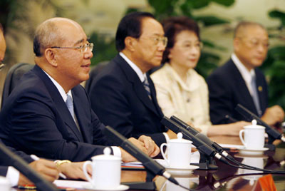 Wu Poh-Hsiung (L), Chairman of Taiwan's Kuomintang and his colleagues meet with Hu Jintao, general secretary of the Central Committee of the Communist Party of China at the Great Hall of the People in Beijing May 28, 2008. [Agencies]