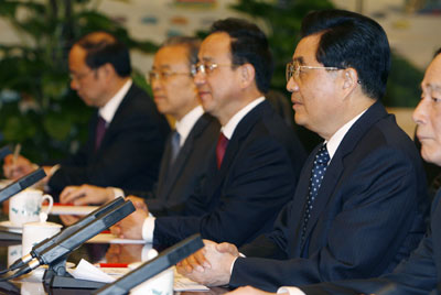 Hu Jintao (R), general secretary of the Central Committee of the Communist Party of China, meets with Wu Poh-Hsiung (not in picture), Chairman of Taiwan Kuomintang and his delegation at the Great Hall of the People in Beijing May 28, 2008. [Agencies]